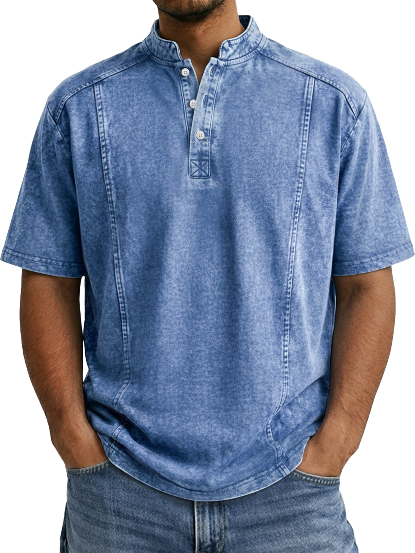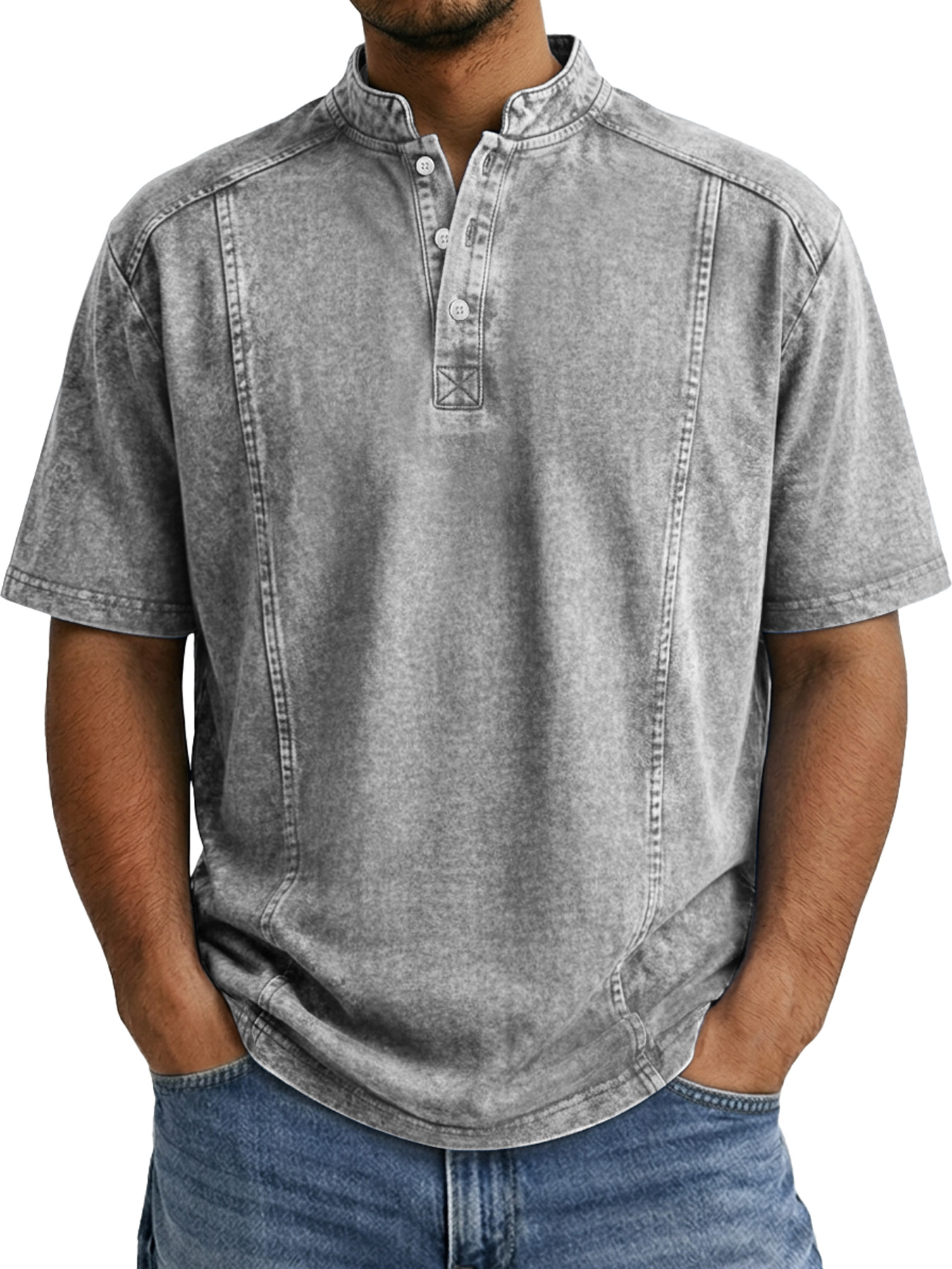 Men's Retro Deconstructed Stand Collar Casual Short Sleeve Henley Shirt