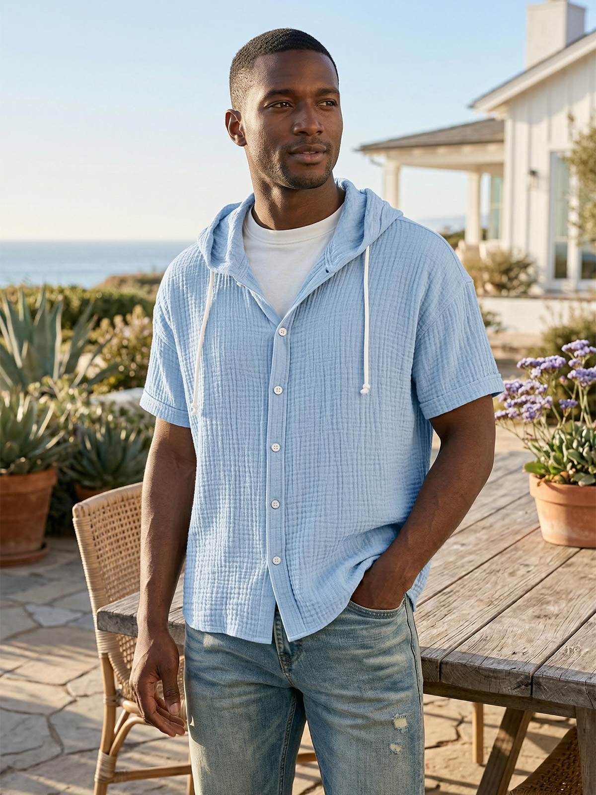 Men's Casual Resort Pleated Hooded Button-down Short Sleeve Shirt