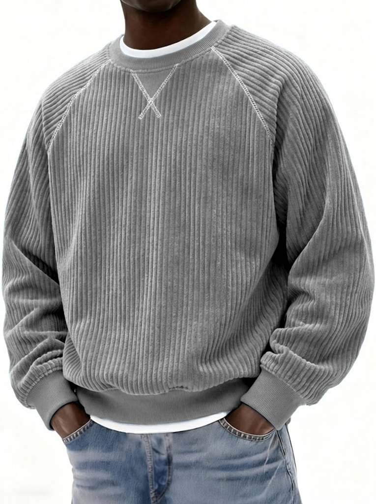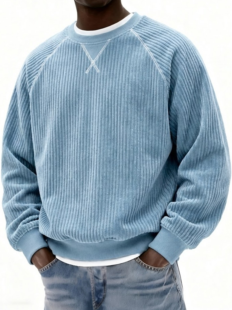 Basic Casual Corduroy Inverted Triangle Design Round Neck Raglan Long-sleeved Sweatshirt