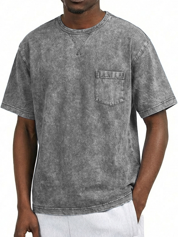 Men's Washed Distressed Cotton Retro Crew Neck Pocket Short-Sleeve T-Shirt