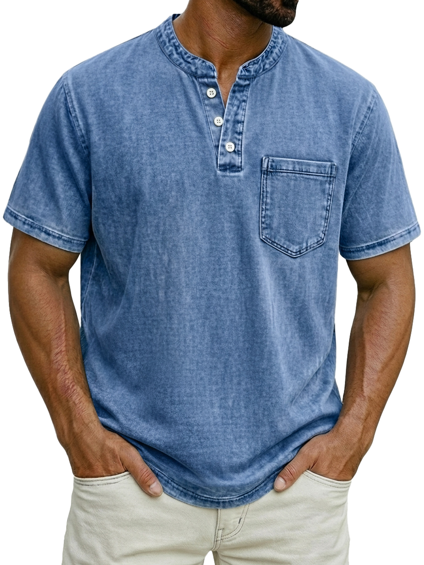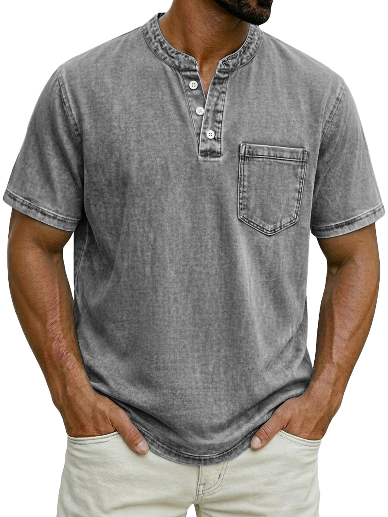 Men's Stand-up Collar Button-down Design Casual Short-sleeved Henley Shirt