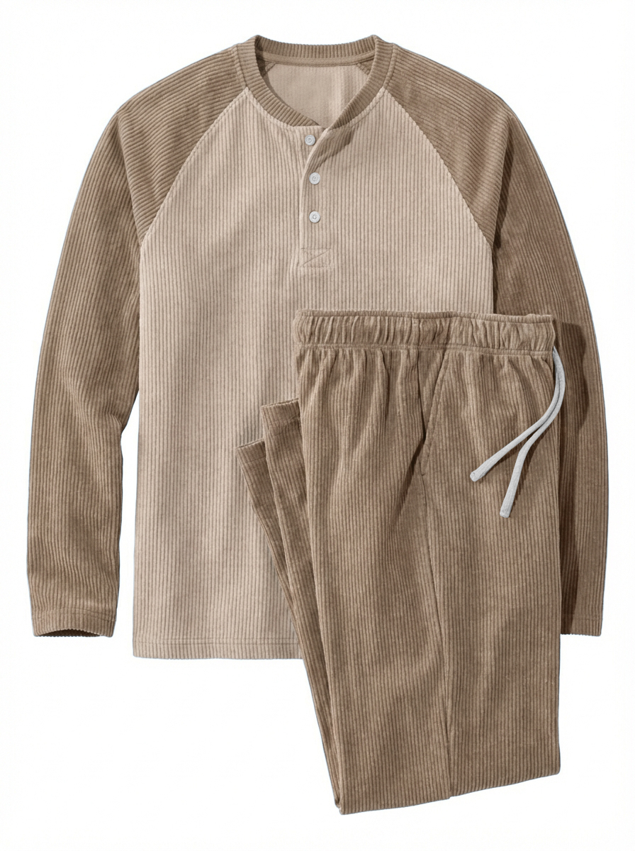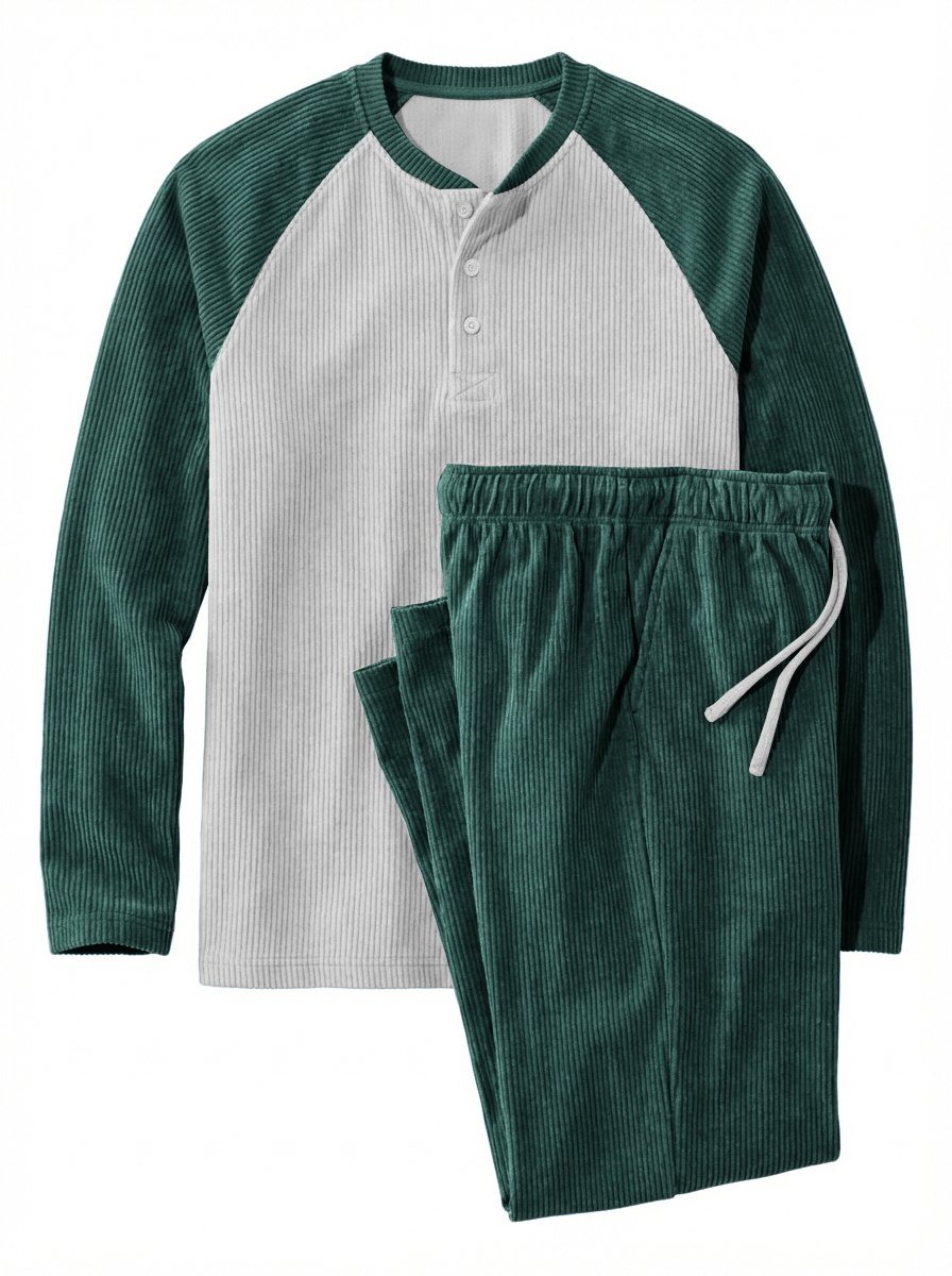 Men's Casual Corduroy Raglan Sleeve Henley Shirt And Pants Set OOTD