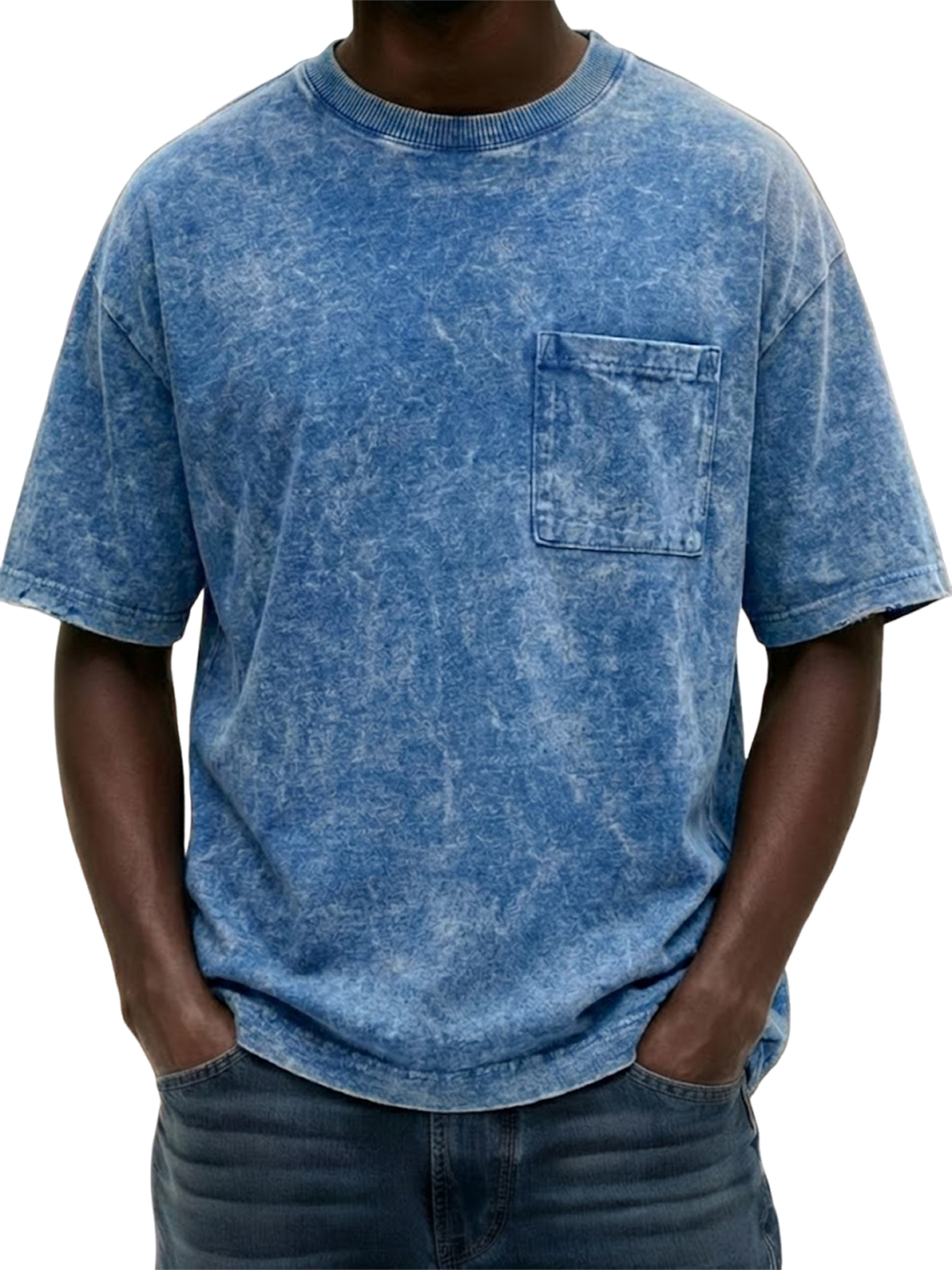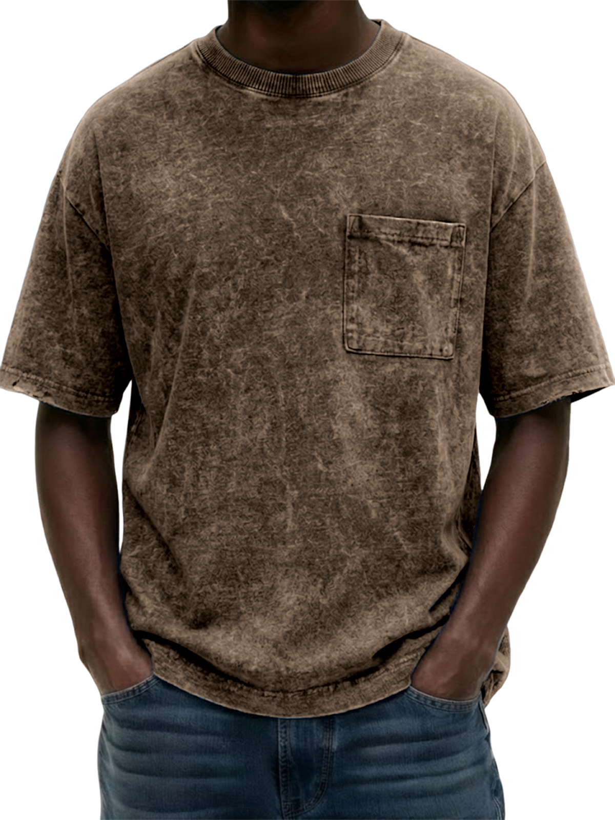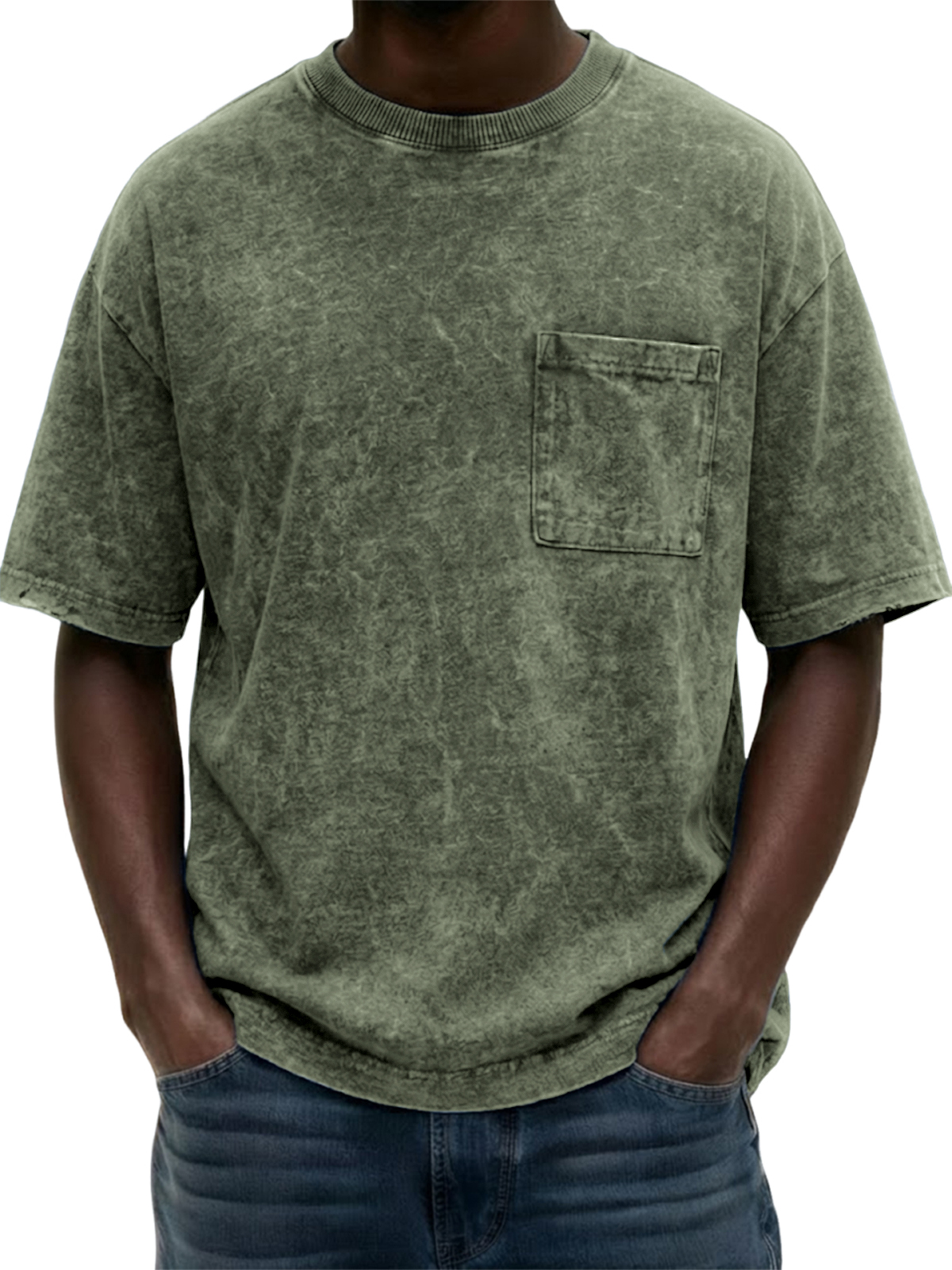 Men's Heavyweight Pure Cotton Washed Distressed Vintage Short-Sleeve T-Shirt with Chest Pocket