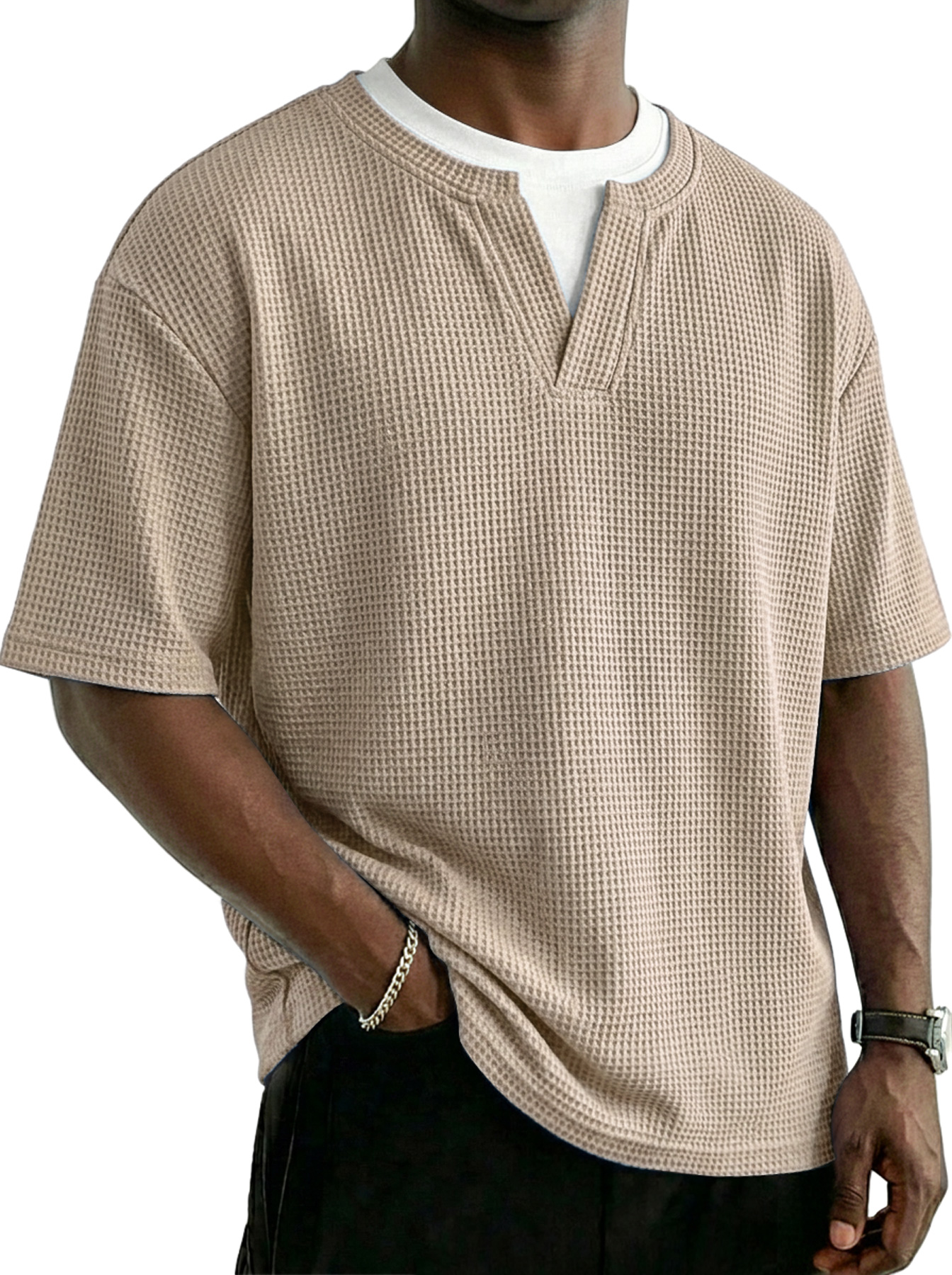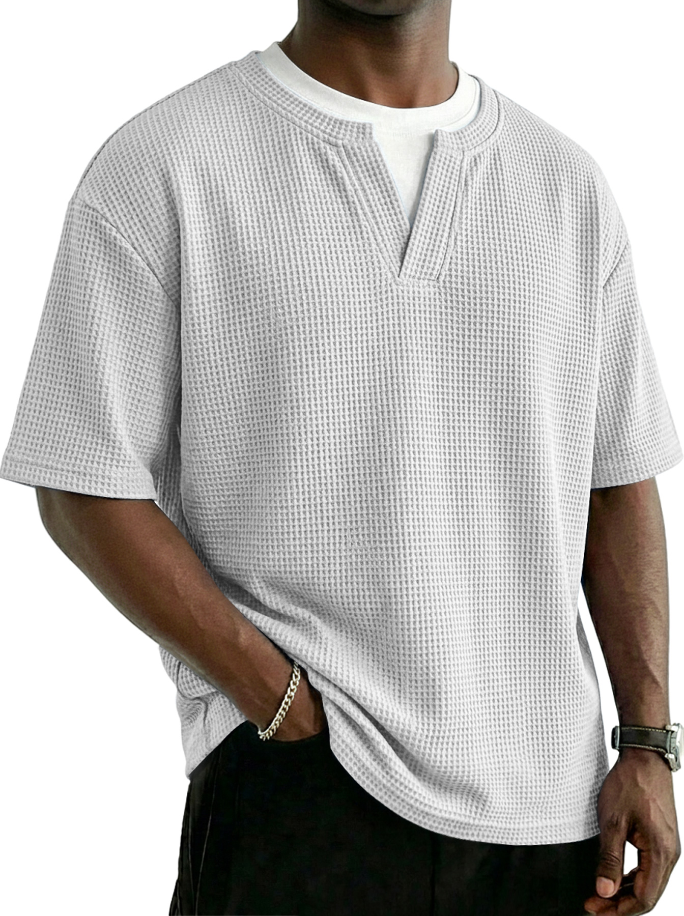 Men's Waffle-knit Faux Two-piece Casual Solid Color Short-sleeved T-shirt