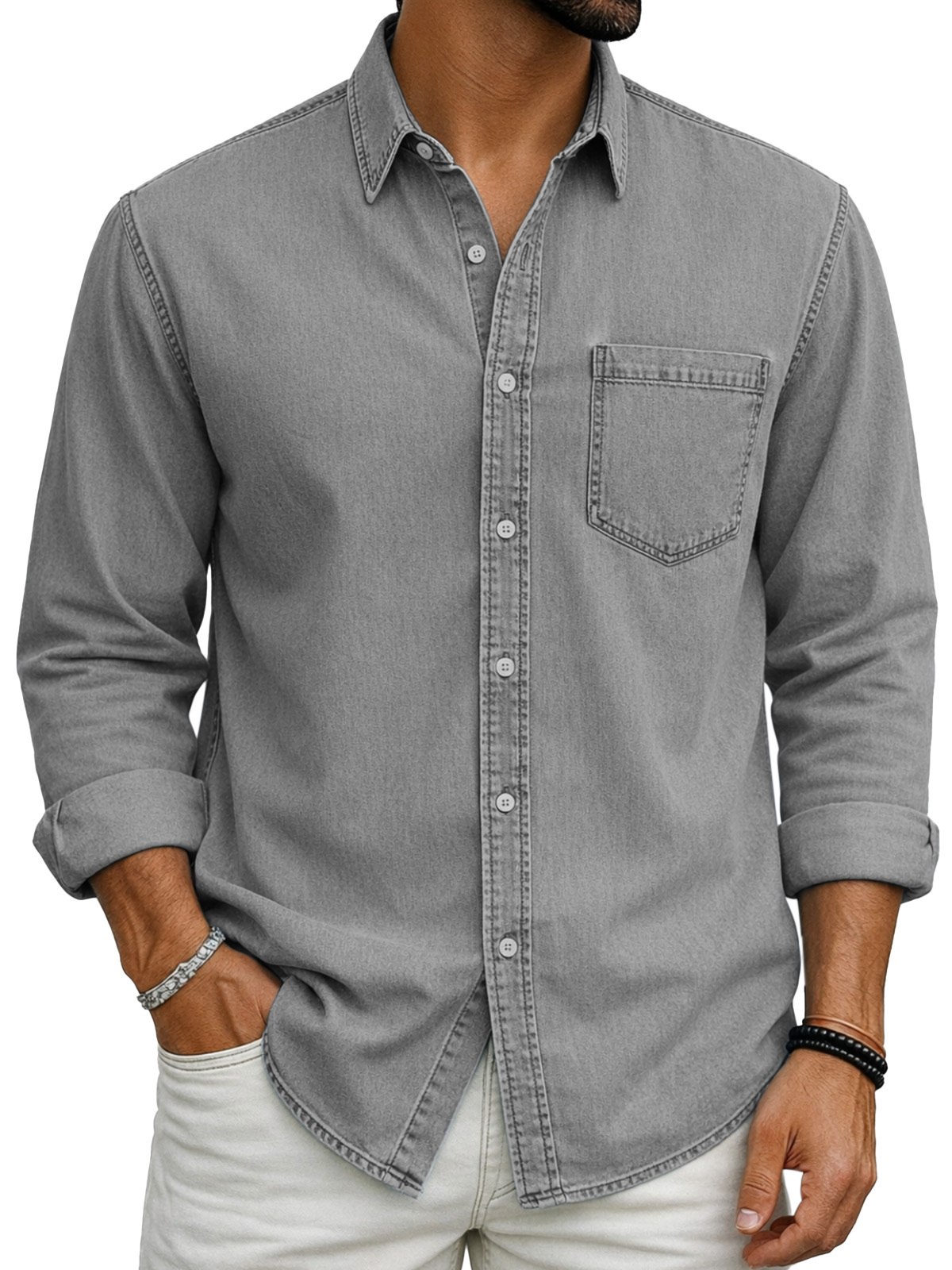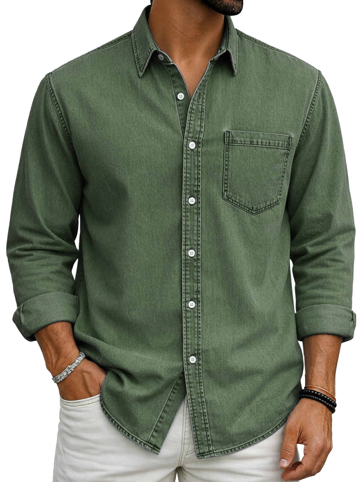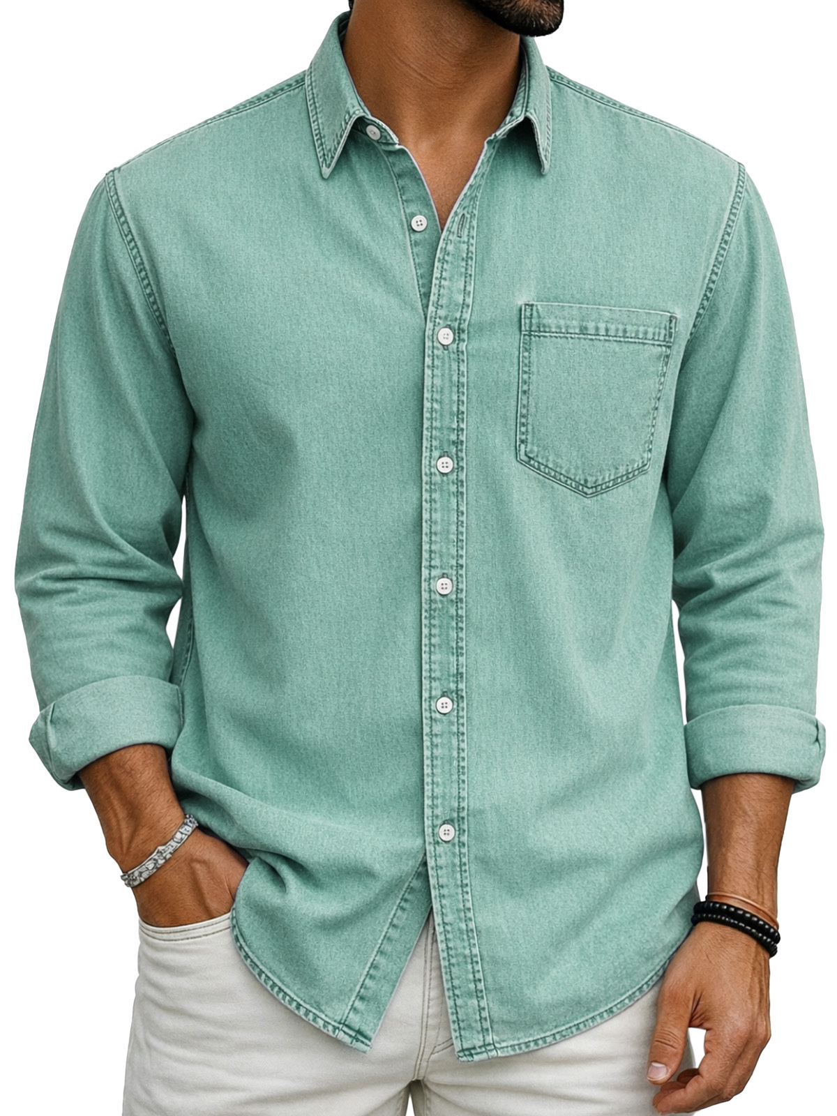 Retro Casual Simple Solid Color Long-Sleeve Polo Shirt with Chest Pocket