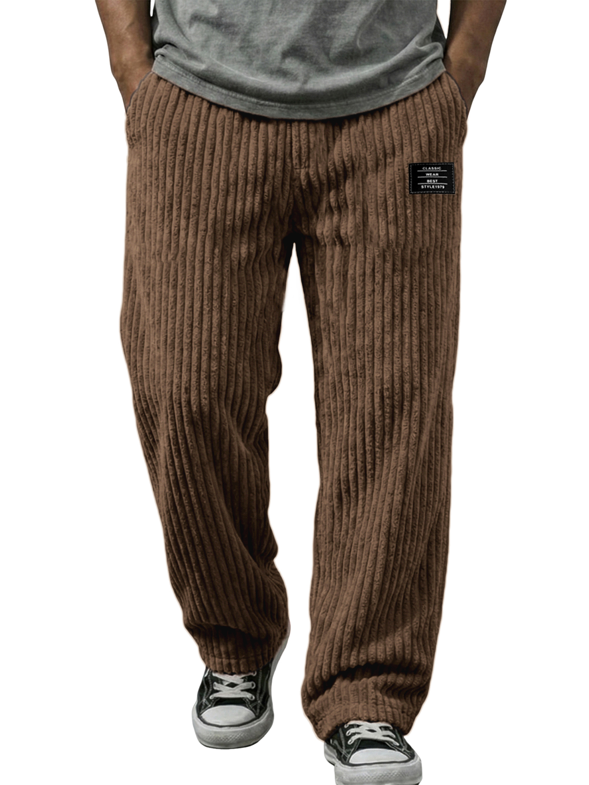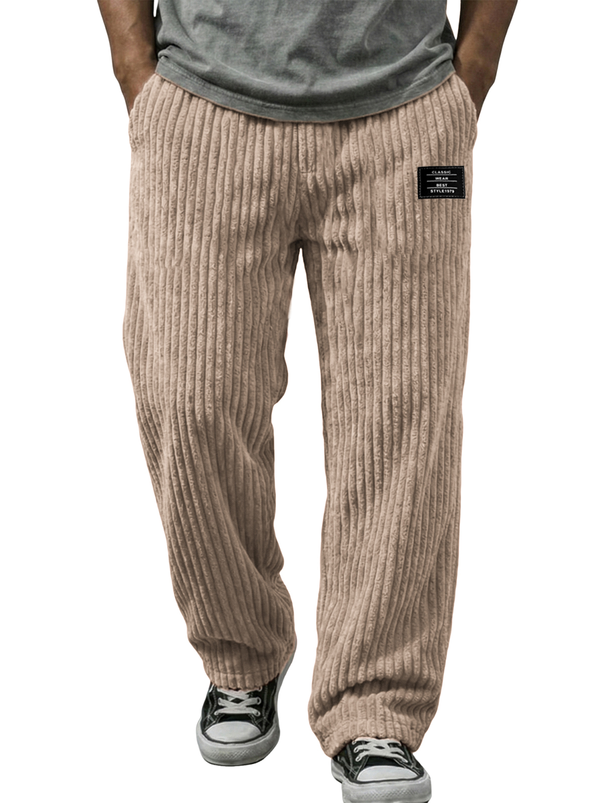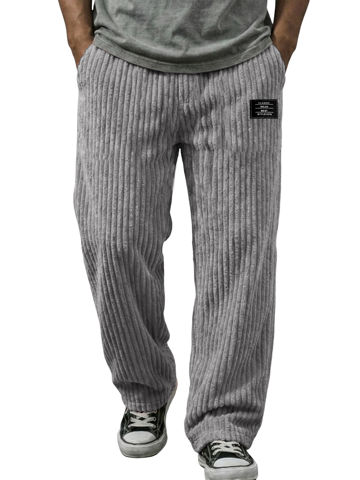 Stylish Vertical Striped Corduroy Trousers with Embroidered Label